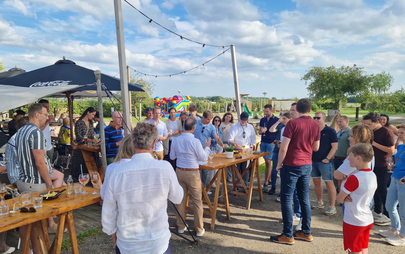 Onder het genot van een hapje en een drankje was er gelegenheid om bij te praten met (nieuwe) collega’s en hun partners, terwijl de kinderen volop gebruik maakten van de speeltuin en de waterbaan. Samen blikten we terug op een mooi jaar vol projecten waar we trots op zijn. Als afsluiter kreeg iedereen een fles wijn en een wijnkoelelement mee.
